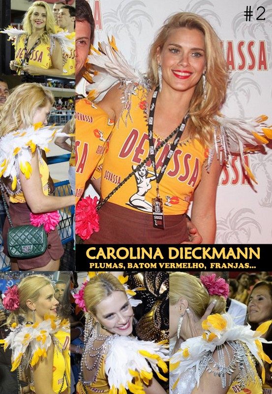 Outro look que adorei e que chegou para arrasar foi o de Carol Dieckmann. Quase uma fantasia de escola de samba. Bem carnaval! Quem diria que batom vermelho, plumas, brinco de franjas, uma flor rosa para cabelo e uma Chanel verde fosse ficar legal? Só em Carol mesmo.