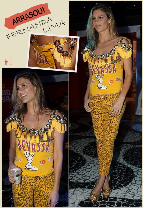 Dentre as milhares de costumizações, escolhi as que mais gostei. Fernandinha Lima arrasou com esse modelito! Adorei essa idéia de contornar toda a blusa com flores douradas e franjas. Sem contar com essa calça animal print (eu quero!)