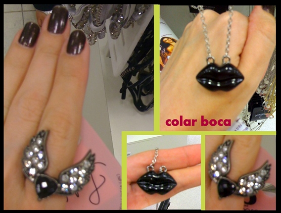 Sou apaixonada pelo estilo Rock`n Roll e essas bijous são a minha cara. O anel é da coleção Isabeli Fontana by C&A. Já o colar de boca é da Renner. Estou louca por um colar de boca. Só não comprei porque a corrente não era lá essas coisas. Acho que na 25 de março deve estar cheia desses acessórios de boquinhas.