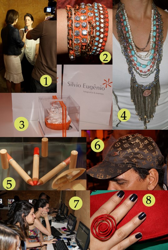 O batom que mais chamou a atenção nos desfiles foi o lápis batom Turmalina Coral do Boticário. Essa cor é perfeita! Custa R$ 26,90 (5); adorei o boné Louis Vuitton do estilista Marcus Telles (6); Camila Coutinho em seu momento criativo (7); anel que foi entregue para imprensa no desfile de Larissa Nunes (8).