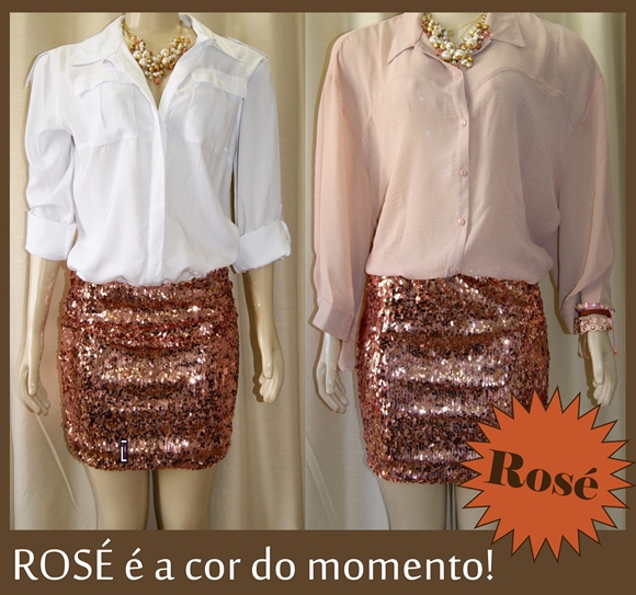 A loja tem tantos modelitos em paetê que mereceu um post só sobre eles. Essa saia de paetê rosé é linda! Não podia perder a oportunidade e acabei levando para casa. Precinho maravilhoso, R$ 159,90! Por falar em paetê rosé, vi na vitrine da Calvin Klein Jeans um look idêntico a esse acima com uma blusa de seda rosé.