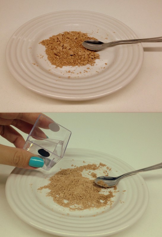 Não tem uma quantidade certa de álcool para colocar (pois depende da quantidade do produto que você vai compactar), você vai ter que ir sentindo aos poucos. Até formar uma pastinha toda uniforme. Nesse caso, coloquei umas 5 colheres de álcool.