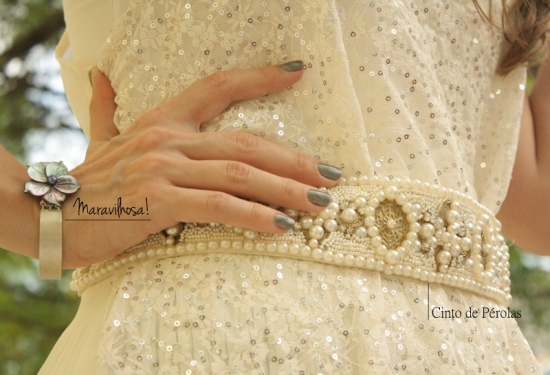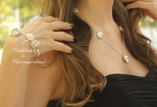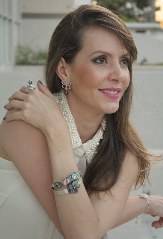 Para as clássicas, fiz uma versão mais clean. O charme fica por conta dos detalhes da gola de pérolas da blusa combinado com o mix de acessórios de pérolas e madrepérolas.