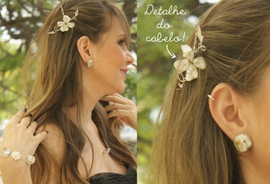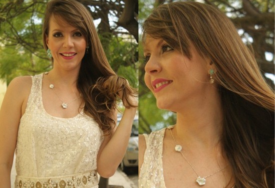 Ameeei o mix desse look. Ficou super moderno! Adoro essa cor!!! Uma combinação ótima para reveillon, festas, batizado… Mais uma vez os brincos em turquesa deram uma cor ao visual. Notem que os brincos são diferentes. De um lado é uma flor grande e no outro é menorzinho.