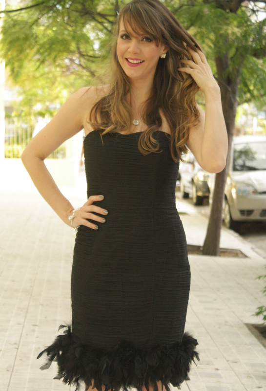 Esse vestido preto com a barra em plumas é uma opção para quem quer um pretinho diferente. Recentemente vi uma pessoa com um modelo nesse estilo em um casamento. Combinei com acessórios em pérolas e madrepérolas. Adorei o grampinho do cabelo, pois dá um charminho e não precisa prender todo.