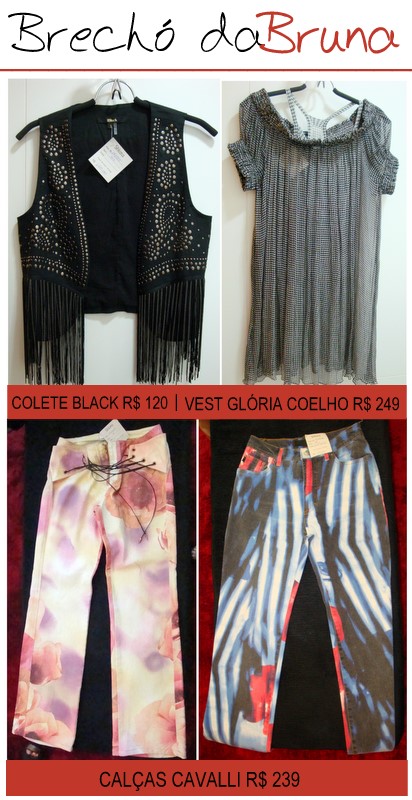 Para quem não viu esse post, a top model Bruna Tenório tem um brechó de luxo na Sfilata. Nesse brechó tem peças super grifadas que Bruna ganha e garimpa pelo mundo a fora. Só tem marcas tops. Olhem essas calças Just Cavalli! Lindas e no precinho! E esse colete de franja parecidíssimo com o da Joulik. Passei um tempão paquerando ele. Veja esse post que fiz sobre as franjas do momento.