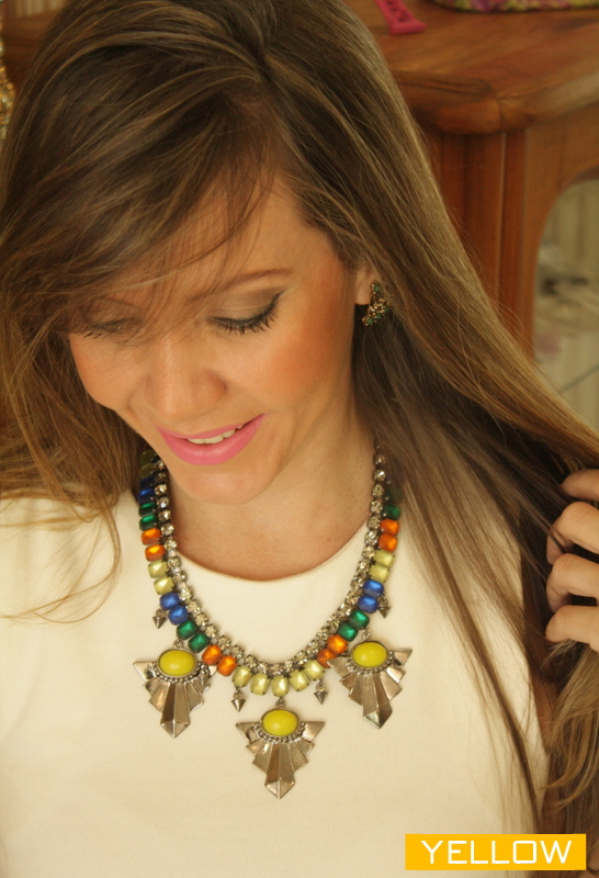 O amarelo não poderia faltar. Adorei a combinação das cores deste colar. Dá para usar em vários looks diferentes. É o típico modelo que vale casa centavo.