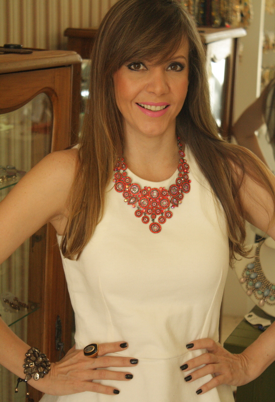 Uma produção super elegante é essa que fiz com o colar vermelho da foto abaixo. Combinei com um bracelete e um anel preto. Muito boa a combinação do vermelho e preto dos acessório com o branco da blusa.