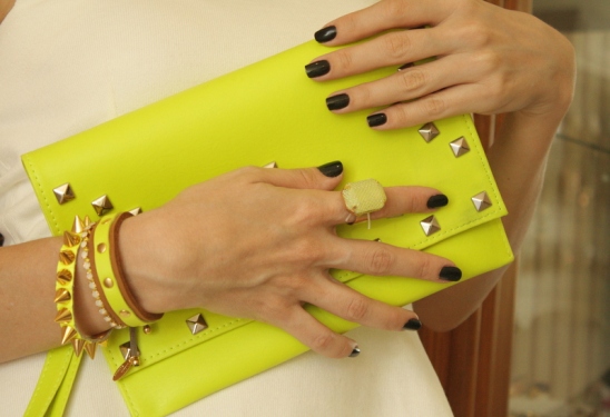 Fiquei doida pela bolsa neon amarela e pelas pulseiras de spikes!! Lindas!