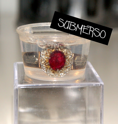 Peguei o líquido e coloquei num copinho de remédio e joguei o anel dentro. Como não dissolveu (brincadeira), acabei deixando uns minutinhos. Depois, tirei o anel e lavei em água corrente. Notei que ficou apenas um pouco mais brilhoso, então peguei um algodão e molhei no líquido e esfreguei o anel. Aí sim, ele começou a limpar mais. Fiquei tão empolgada que peguei um palito de unha com algodão e fui limpando os cantinhos. No final lavei em água corrente e seguei com um pano.