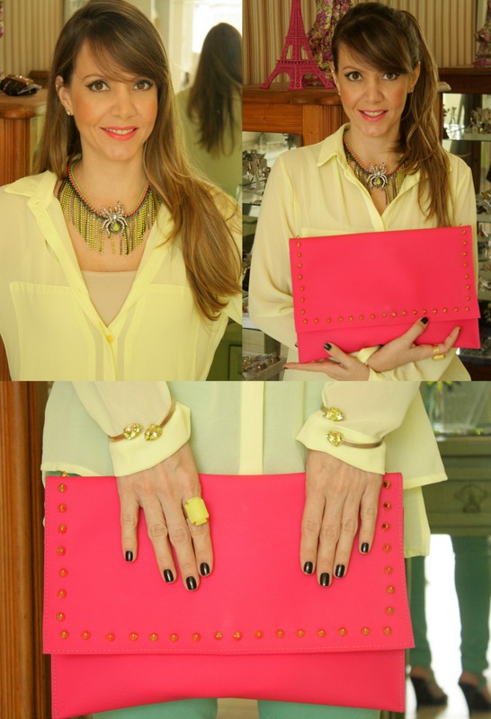 Você sempre arrasando nas combinações, amei a clutch rosa neon com tachas, e o colar de correntes.