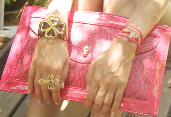 Olha que arraso essa maxi clutch pink. Esse modelo quebrou a monotonia do look.