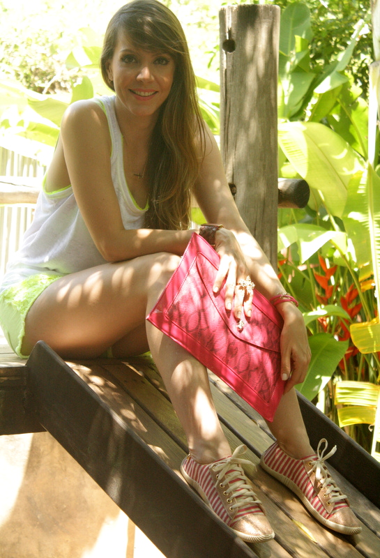 Já essa bolsa neon, tem um cantinho especial abaixo do laço para colocar a mão. Fica uma graça!