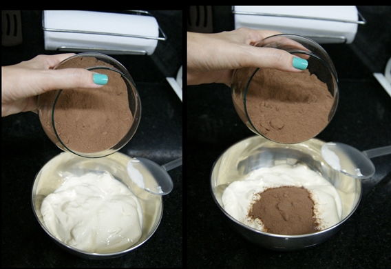 2. Coloque o creme de leite em uma tigela e acrescente aos poucos o achocolatado. Não tenho uma quantidade fixa de achocolatado. Vou observando até ficar escurinho.