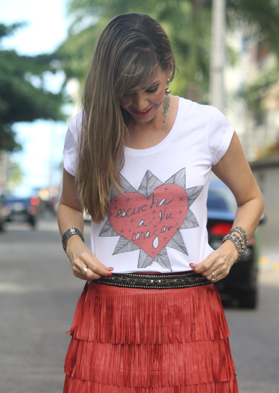 Nesse último look,  fiz uma versão mais moderninha com o modelo Escucha a Tu Corazon. Apostei na saia de franjas e um cinto de spike.