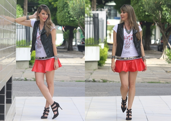 No primeiro look, usei a T-shirt Love Explosion. Fiz um look mais descoladinho com saia rodada e colete. Incrementei o visual com cintos e um maxi colar. Uma opção legal para lugares mais descontraídos.
