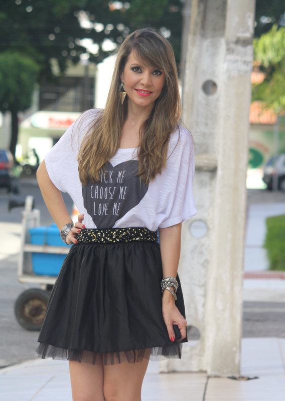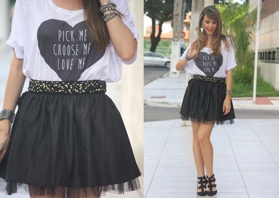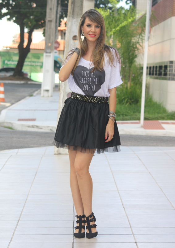 Com a t-shirt Pick Me, Choose Me, Love Me preferi fazer um look mais romântico com cintura marcada e saia de tule. Adoro looks nesse estilo!!!