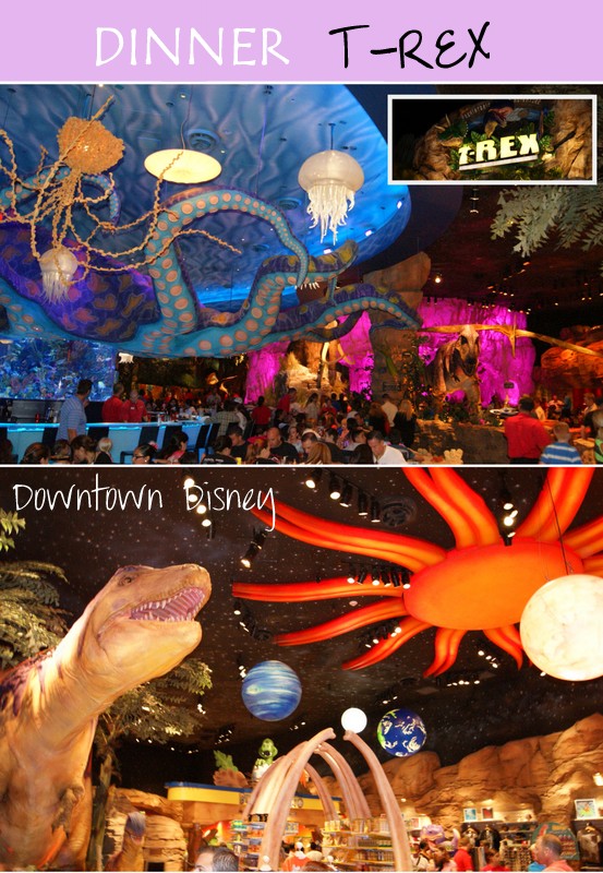 Quem está viajando com criança e quer comer num lugar legal, vale a pena levar a meninada para jantar no T-Rex. O T-Rex é um restaurante temático (de dinossauro) que fica em Disney Downtown. Nunca precisei fazer reserva, mas já peguei fila de trinta minutos. Além do ambiente ser cinematográfico, a comida e o preço são bons.