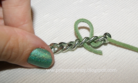 Passo 3 – Passe a fita de couro por dentro dos elos da corrente mais grossa.