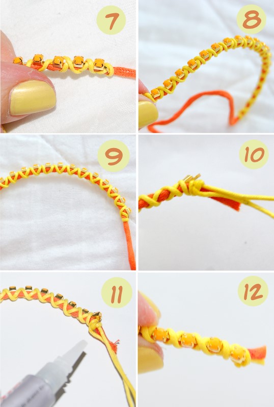 7, 8 e 9. Verifique que a cordinha vai formando um “x” e pulsirinha vai tomando forma.