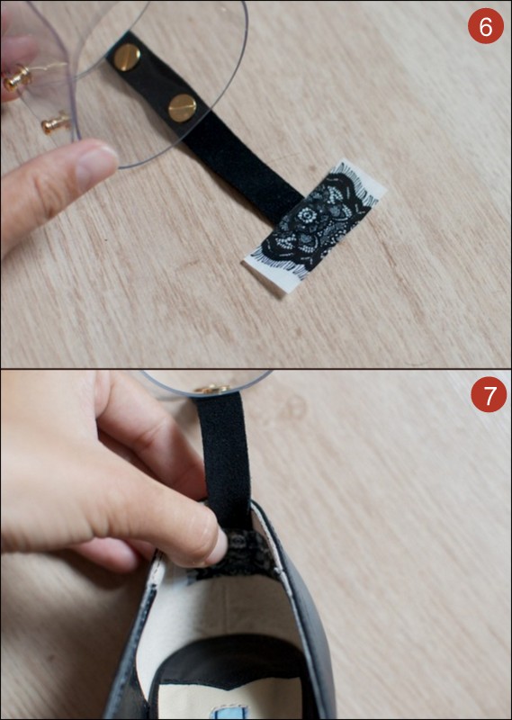 Para fixar a tira de couro no sapato, pegue um pedaço de tecido macio e cole no sapato, como na foto 6 e 7.