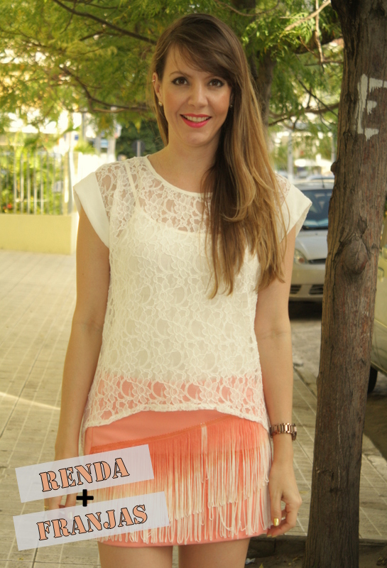 As franjas estão cada vez mais nas roupas. Eu adoro saia de franjas, já coloquei alguns looks aqui no blog com elas (veja aqui e aqui). Nesse look usei com uma blusinha de renda manga curta para deixar o look mais descontraído.