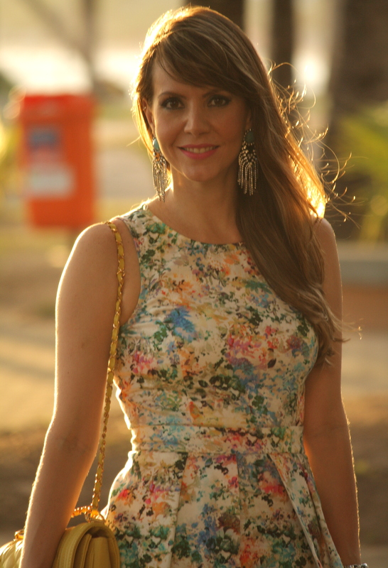 O look de hoje é um peplum floral que comprei pensando no verão. Combinei o vestido com sandália branca (elas voltaram), bolsa amarela (minha atual paixão) e maxi brincos.