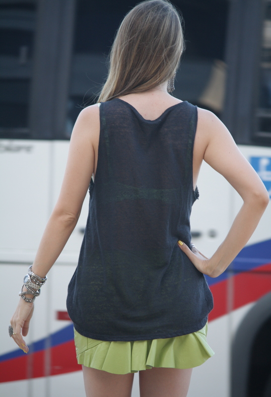 A peça de roupa que mais usei nesse verão foi t-shirt. Elas ficam legais com quase tudo. Nessa vez, apostei usar a t-shirt com uma saia de couro.