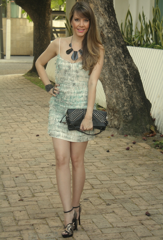 Por fim, não poderia faltar um modelinho preto. Como o sapato muitas vezes levanta a produção, escolhi o preto com aplicações de tachinhas. Essa sandália calça super bem. Ela praticamente abraça o pé. Combinei com a bolsa estilo carteira (amei) com spikes e acessórios em tons de preto. Uma produção bem legal!