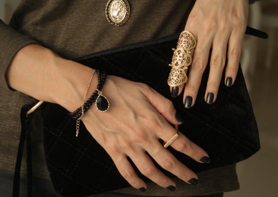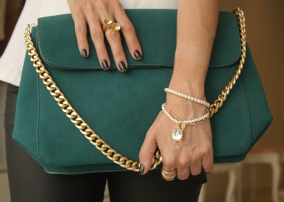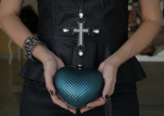 Ando numa fase de usar e abusar de maxi brincos e não resisti a esse brinco preto com petróleo. Vejam como ele ficou legal com a clutch de coração (que me conquistou). Também estou adorando os colares mais compridinhos com cruz (no último desfile de Dolce & Gabbana só deu isso. Veja aqui).