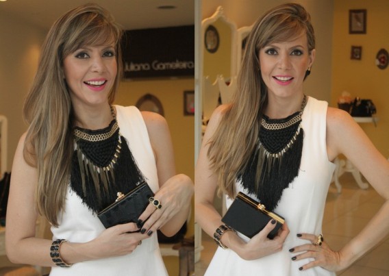 Uma peça que é “a roupa” é esse colar preto. Basta um look basiquinho e pronto! Gamei nessa clutch preta. Achei tão elegante.