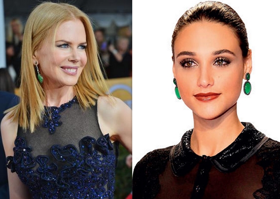 De uns tempos para cá, tenho notado que muitas famosas estão investindo nos brincos verde esmeralda. Acho linda essa cor e ela cai bem em vários tipos de produções.