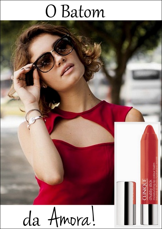 Amora usa um batom nude que combina muito bem com a pele dela. O batom é o Chubby Stick Moisturizing, da Clinique, na cor Overside Orange.