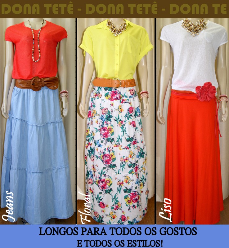 Os modelitos acima mostram que têm opções para todas! Na 284 tinha uma saia longa jeans bem parecida com essa da foto. Não importa idade, tamanho, gosto, etc. Na Dona Tetê você encontra peças liiindas, dá para sair com o look completo.