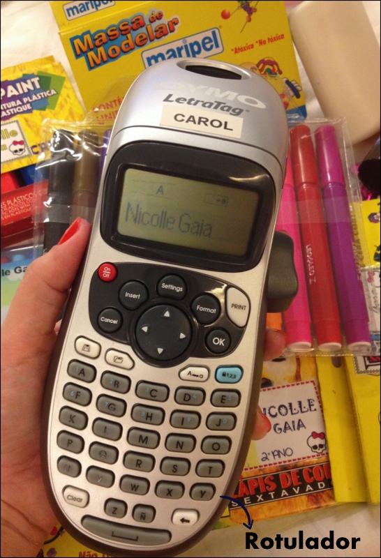 Primeiro de tudo, quem puder, vale a pena comprar uma maquininha rotuladora. Eu comprei a minha quando minha filha entrou na escola e até hoje uso ela. Esse aparelhinho rotulador imprime etiquetas com os nomes que você digitar. Ele é ótimo para organização. Uso também no meu trabalho. Sem contar que as etiquetas têm uma fixação muito boa. Serve para identificar copos, depósitos…todos os materiais laváveis.