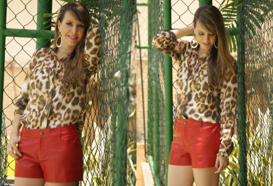 Animal print fica bom com peças neutras, como esse shortinho de couro ecológico.