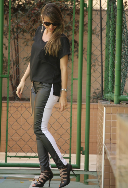Ameeei de paixão essa calça! Ela é de couro na frente e de sarja com lycra na parte de trás. Veste suuuper bem.