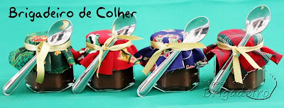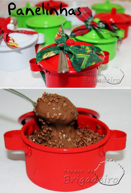 Mini caçarolas nas cores vermelha, branca ou verde com brigadeiro de colher. Delícia!!!
