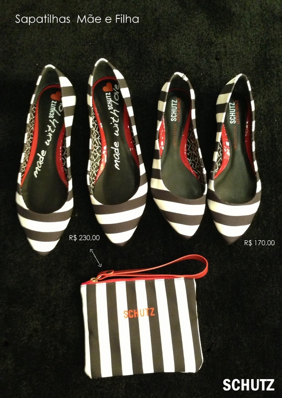 A Schutz lançou nesse ano um modelo especial mãe e filha para essa ocasião. Para a filha é a sapatilha listrada e para a mãe pode ser a sapatilha ou um scarpim de salto com a mesma estampa. Na compra da sapatilha adulto, vem essa bolsinha da foto.