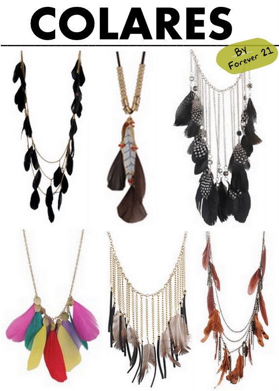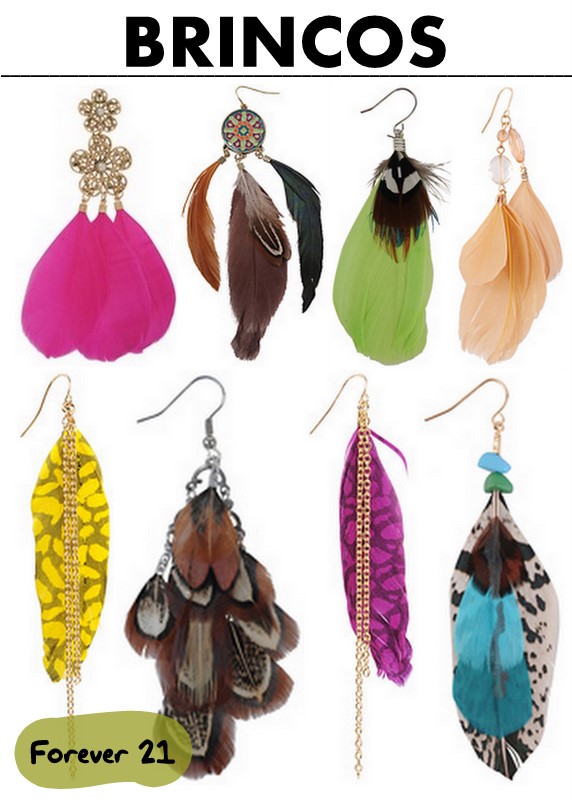 Semana passada aproveitei uma noite de folga para dar uma olhada nos acessórios do site da Forever 21. O que me surpreendeu foi a quantidade de acessórios de pena. E quando uma tendência chega nos EUA, é um sinal que em breve ela deverá estar chegando por aqui também.