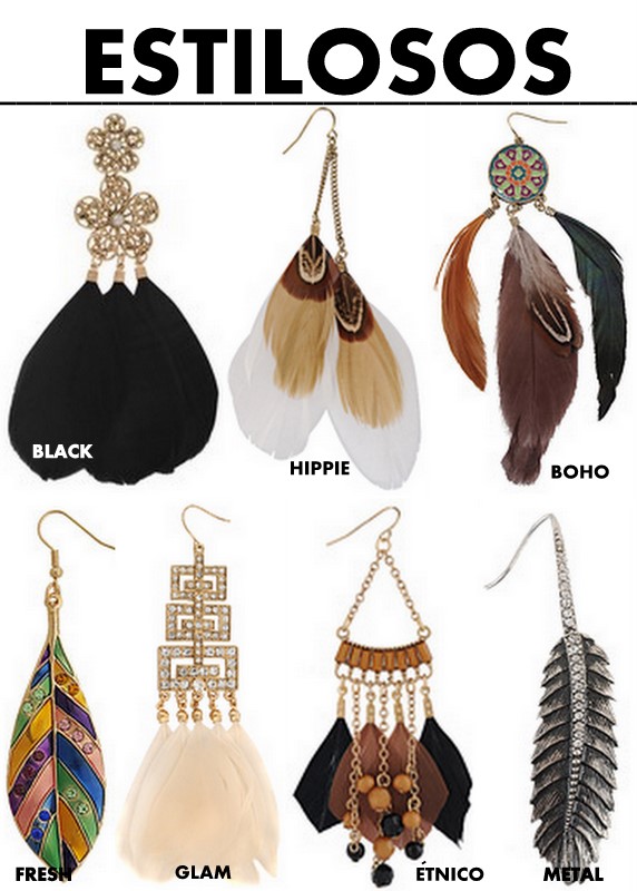 Além dos modelos tradicionais, os brincos de pena estão mais estilizados com correntinhas, strass, metais, etc. Agora as penas saem da praia e vão às festa!